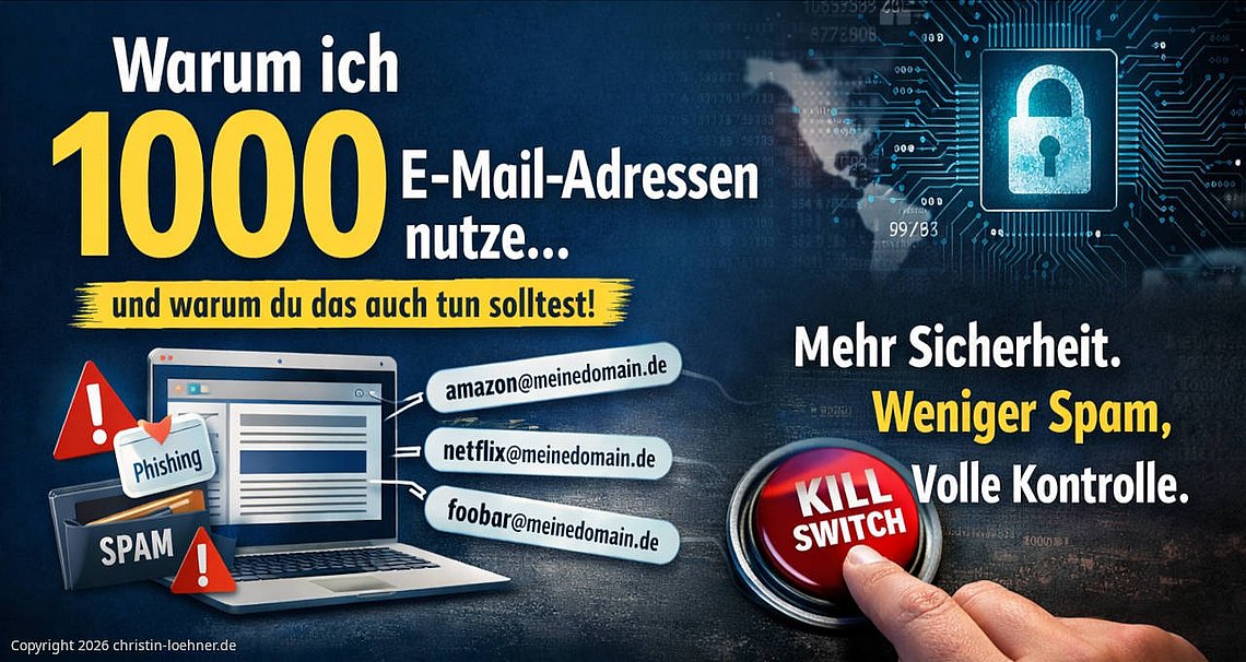 Wenn Du überall dieselbe Adresse nutzt und sie wird von Spam überrollt, hast Du im Grunde nur drei Optionen: Du lebst damit. Du drehst Spamfilter aggressiver, mit dem Risiko, dass echte Mails verschwinden. Oder Du wechselst Deine Adresse, und das ist in der Praxis der blanke Horror, weil Du überall die neue Adresse eintragen, Kontakte informieren, Accounts aktualisieren und hoffen musst, dass Du nichts vergisst.