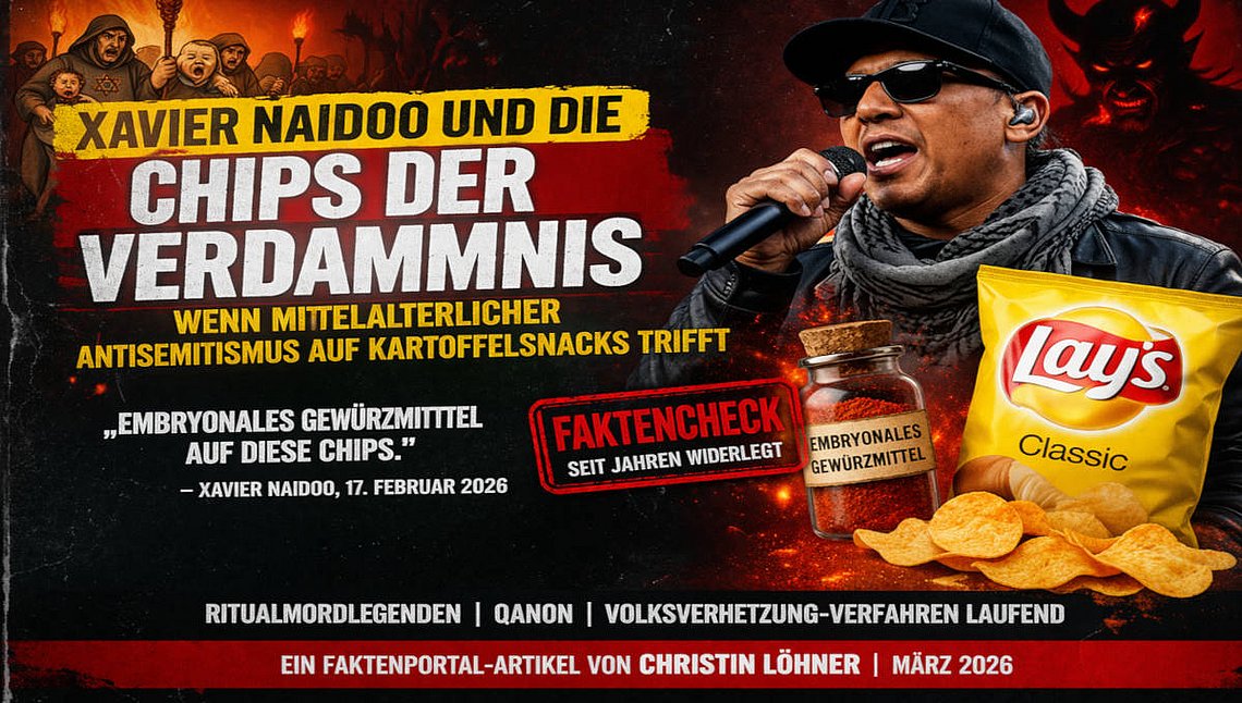 Er hat Recht. Die sogenannte Ritualmordlegende, also die Behauptung, Jüdinnen und Juden würden Kinder töten, um deren Blut für rituelle Zwecke zu nutzen, existiert seit dem 12. Jahrhundert. Sie hat Pogrome ausgelöst. Sie hat Menschen das Leben gekostet. Sie ist einer der ältesten, zählebigsten und gefährlichsten antisemitischen Mythen der europäischen Geschichte, und Xavier Naidoo recycelt sie 2026 als Chips-Marketing. Er verpackt sie in moderne Scheinwissenschaft, tauft sie "embryonales Gewürzmittel" und präsentiert sie vor Kameras rechter Streamer als frische Enthüllung. Das ist kein Versehen. Das ist kein Irrtum eines verwirrten Künstlers. Das ist Antisemitismus mit Chili-Aroma.